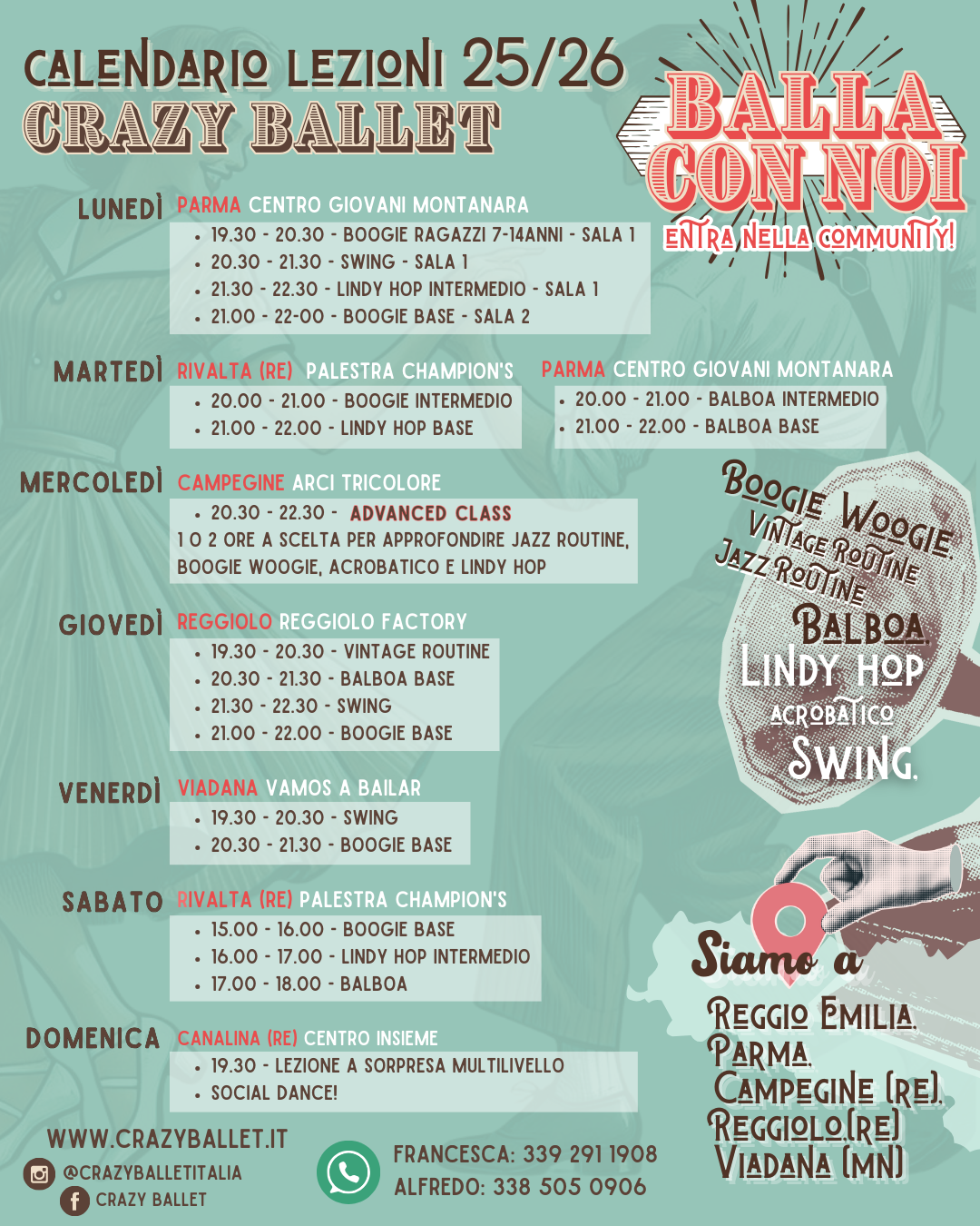 I nostri corsi di ballo sono a: Reggio Emilia, Parma, Campegine (RE), Reggio Emilia , Reggiolo (RE) e Viadana (MN)
